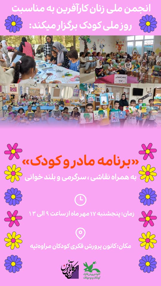 انجمن ملی زنان کارآفرین با همکاری کانون پرورش فکری کودکان و نوجوانان، به مناسبت روز کودک، برگزار میکند: